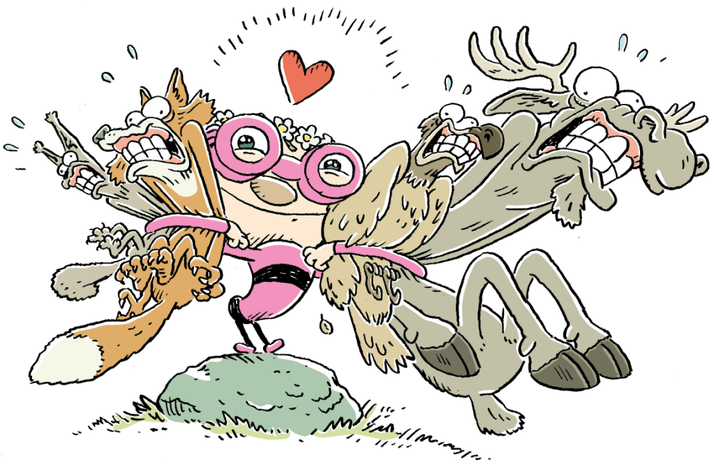 Sami: Aino mindig pontosan ráérez, melyik ötlet lesz az, ami működni fog, és melyik az, amit inkább érdemes elvetni, és ő az, aki mindig képes újítani, átlépni a korábbi határokat. Ezért alakult ki így a munkamegosztás. Nekem kezdetben nehéz volt viccesre rajzolni a figurákat, de Aino mindig biztatott, legyenek még mókásabbak, még hangsúlyosabbak, és bátran csináljanak szokatlan dolgokat is. Mára persze belerázódtam.