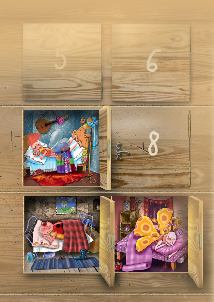 – Ez nagyon fura… – motyogta Triinu, és ujja hegyével lenyomta annak az ablaknak a kilincsét, amelyen az egyes szám állt. Az ablak kinyílt, és a gyerekek egy cseppnyi szobát pillantottak meg, benne egy még kisebb ággyal. Az ágyban egy légy szunyókált, füléig húzott takaró alatt.