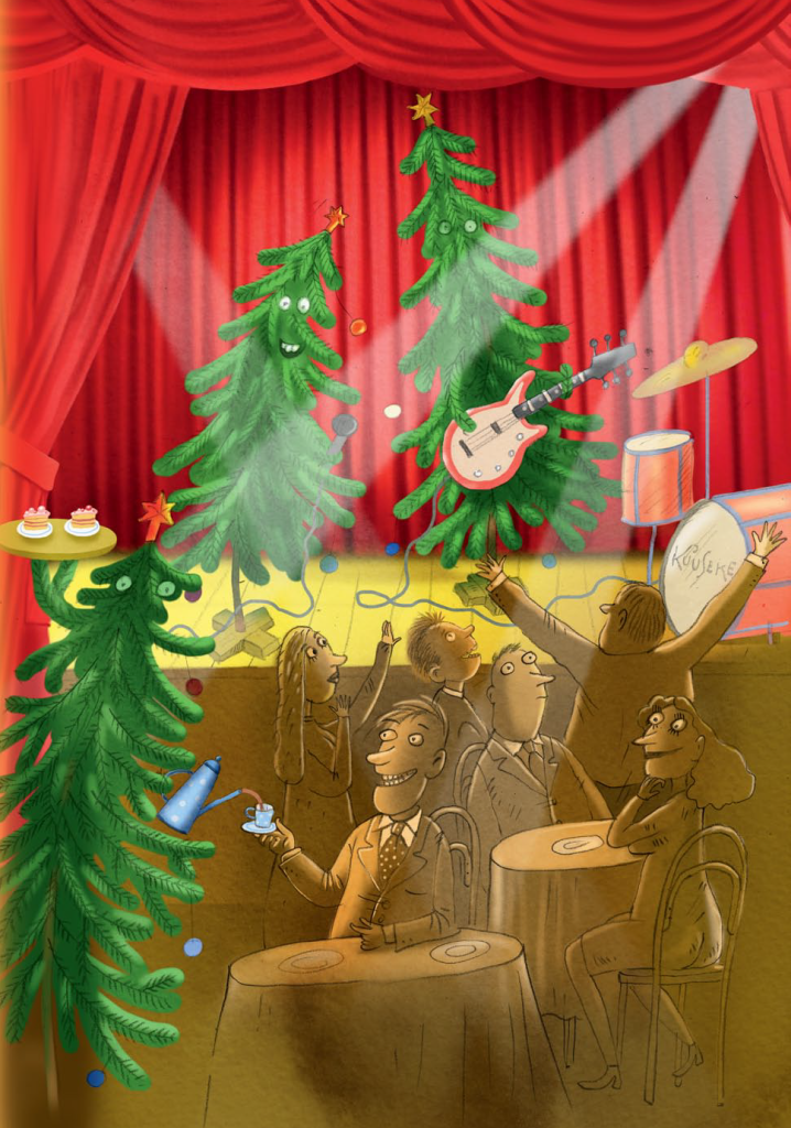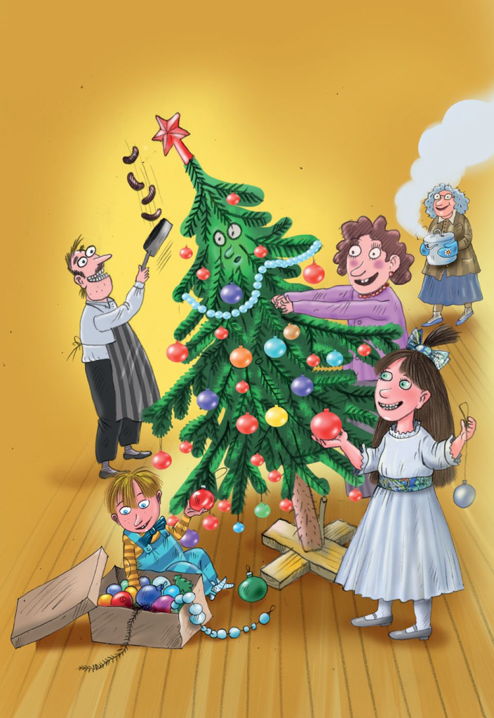 Karácsonykor a fenyőt bevitték a szobába. Nagyon tetszett neki az új helyen. Korábban az erdőben élt a többi fenyő között, és ez meglehetősen unalmas volt. Balra nézett – fenyők. Jobbra nézett – megint csak fenyők. Semmi mást nem látott. Régóta vágyott arra, hogy izgalmasabb helyre költözzön, és valami hasznosat tanuljon.