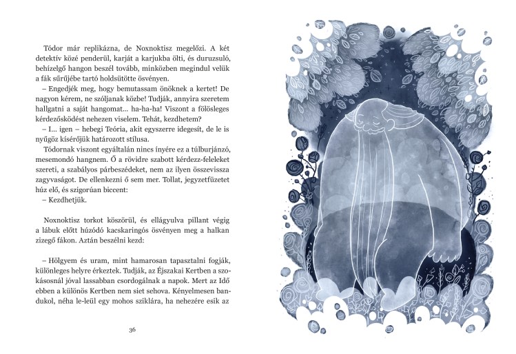 Az Éjszakai Kert az a hely, ahol a madár se jár, ahol senki nem szokott sétálni, és aminek még a környékét is messziről kerülik a város lakói. De Tódor és Teória, a két rátermett nyomozó mégis belépnek a vasrácsos kapun. A vezetőjükül szegődő különös figura, Noxnoktisz pedig csak mesél és mesél, így a két detektív előtt rövidesen feltárulnak a kert rejtélyei, és megismerik számtalan fura lakóját. Lassacskán minden és mindenki gyanús… A detektíveknek az összes tudásukat latba kell tehát vetniük, ha ki akarják deríteni, ki állhat a titokzatos ügy hátterében.