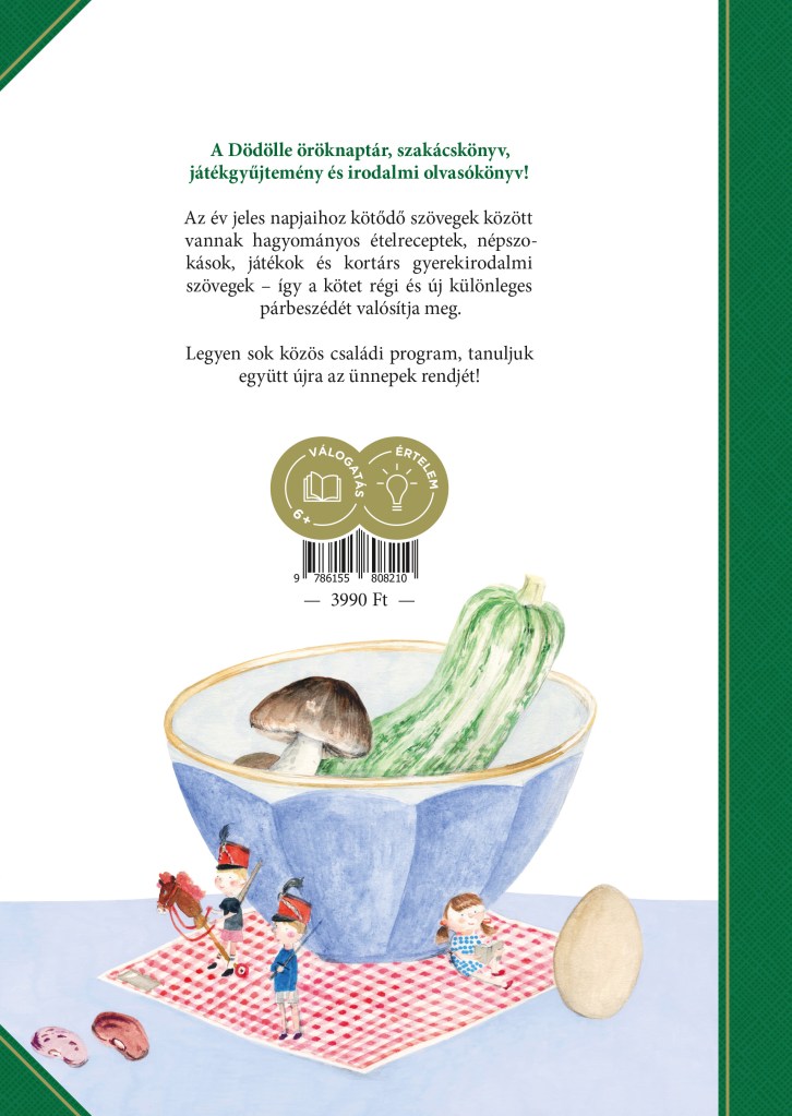 A Dödölle öröknaptár, szakácskönyv, játékgyűjtemény és irodalmi olvasókönyv! Az év jeles napjaihoz kötődő szövegek között vannak hagyományos ételreceptek, népszokások, játékok és kortárs gyerekirodalmi szövegek – így a kötet régi és új különleges párbeszédét valósítja meg.