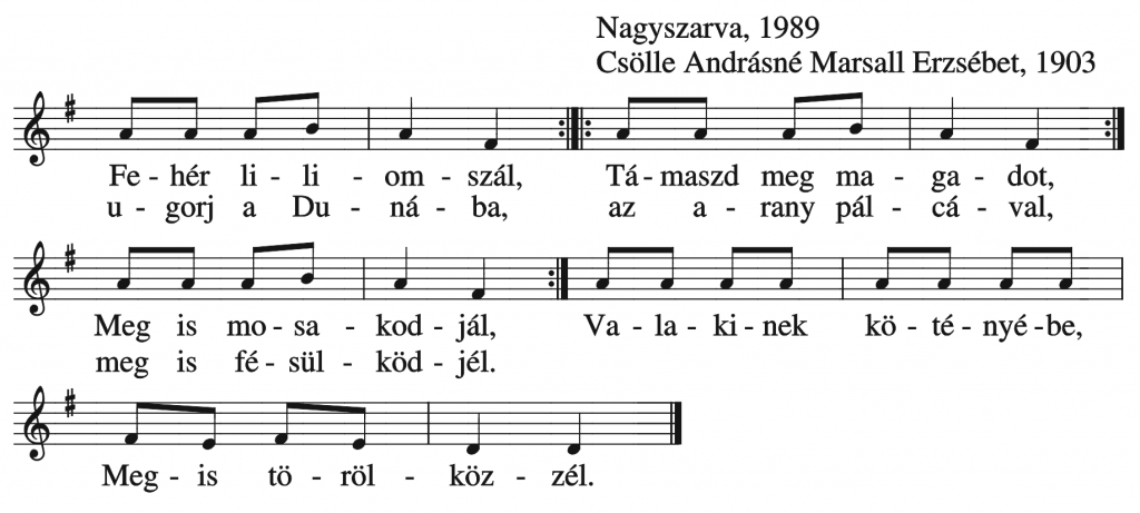 [3] Forrás: Szlovákiai Magyar Művelődési Intézet – Dunaszerdahely https://csemadok.sk/nepzenei-adatbazis/feher-liliomszal-ugorj-a-dunaba-4/