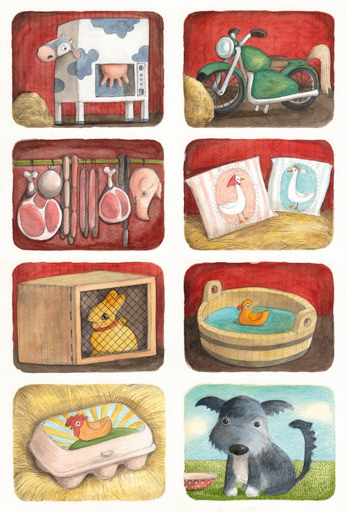 A szarvasmarhát tejautomatává, a lovat csillogó, kereklámpás motorrá, a disznókat hurkává, sonkává, szalámivá, a szamarat kedves, pántlikás kordévá, a libákat pihepuha párnákká, a nyulakat üreges csokifi gurává, a kacsákat sípoló fürdőjátékká, a tyúkokat bedobozolt tojássá, a macskát doromboló plüssállatkává.